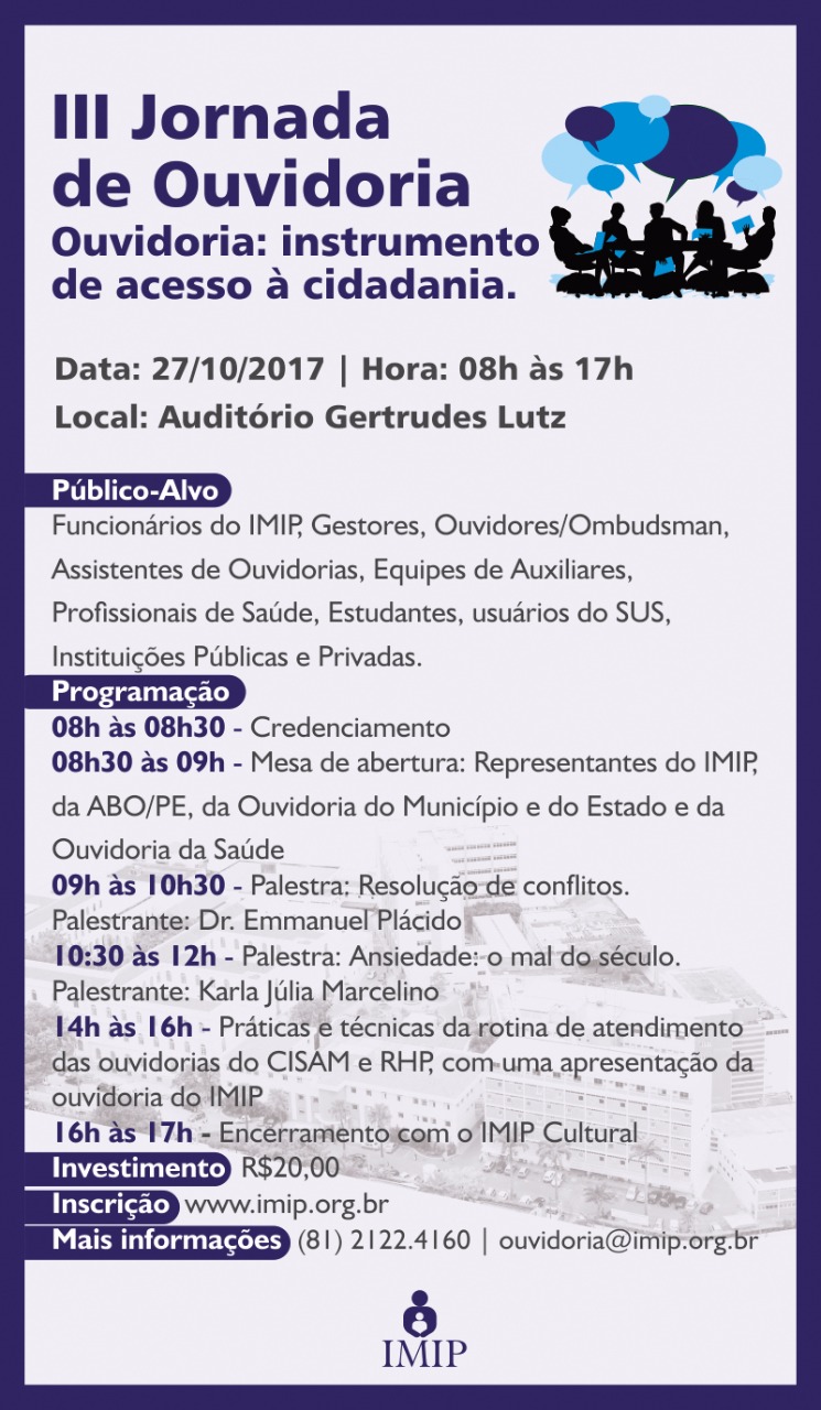 04 Outubro 2017 04 Outubro 2017 III Jornada de Ouvidoria Ocorrerá no IMIP No dia 27/10/17 a ouvidoria do IMIP estará realizando a III Jornada de Ouvidoria. Sendo assim, gostaríamos de contar com a participação de todos vocês. Confira o banner de divulgação do evento Anterior Próximo