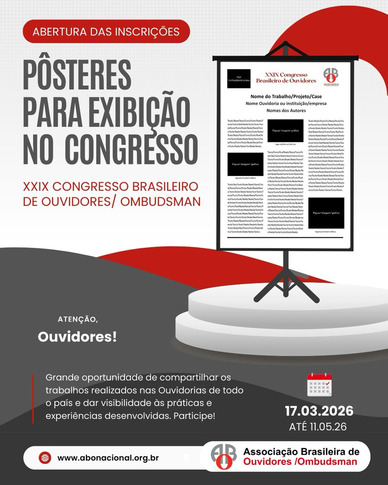 A ABO Nacional lançou o Edital de Pôsteres do XXIX Congresso Brasileiro de Ouvidores, que ocorrerá no período de 17 a 19 de agosto de 2026, no Mar Hotel/PE.