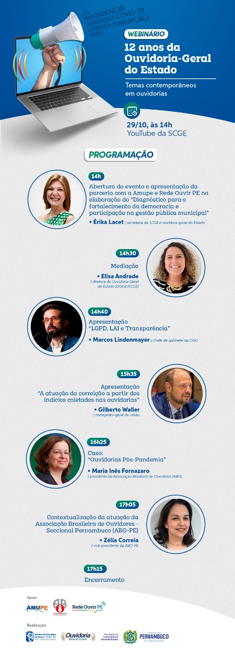 Ainda estiveram presentes ao encontro virtual o desembargador e ouvidor do TJPE, Eduardo Sertório Canto; a coordenadora da Ouvidoria do TCE-PE, Priscila Monteiro; e o procurador e ouvidor-executivo da Alepe, Douglas Moreno. Além de Ana Nery, a Amupe foi representada por Verônica Ribeiro. Já pela CGU, participaram Abelardo Lopes e Mariana Acioly; e, pela ABO-PE, Zélia Correia, vice-presidente da entidade e coordenadora de Atendimento ao Cidadão da OGE/SCGE.